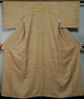 商品説明 | 小花模様の地織が入った地を亜麻色に染め、 薄っすらと虹色ぼかしも施した色無地です。 ※衿に極薄い着用汚れがあります。 |