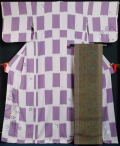 商品説明 | 白藤色のちりめん地に紫色の市松に桜・藤模様が染められた訪問着と、 藍墨茶色の紬地に縞に更紗模様が染められた洒落袋帯の2点セットです。 ※着物の肩山・袖口・八掛裾に少し色ヤケがあります。 帯は使用はされており、目立つシミや汚れはありませんが、 両方から半分に折られています。 もやっとした濃淡に見えますが全体にありますので作風かと思います。 柄付け:全通柄 |
