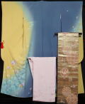 緑黄色・青藤色のちりめん地に八重桜模様が染められた振袖と、渋めの金・浅縹色ぼかしの地に鳳凰、更紗・華文模様などが織られた袋帯、流水に桜・橘模様の地織が入った薄ピンク色の長襦袢の3点セットです。